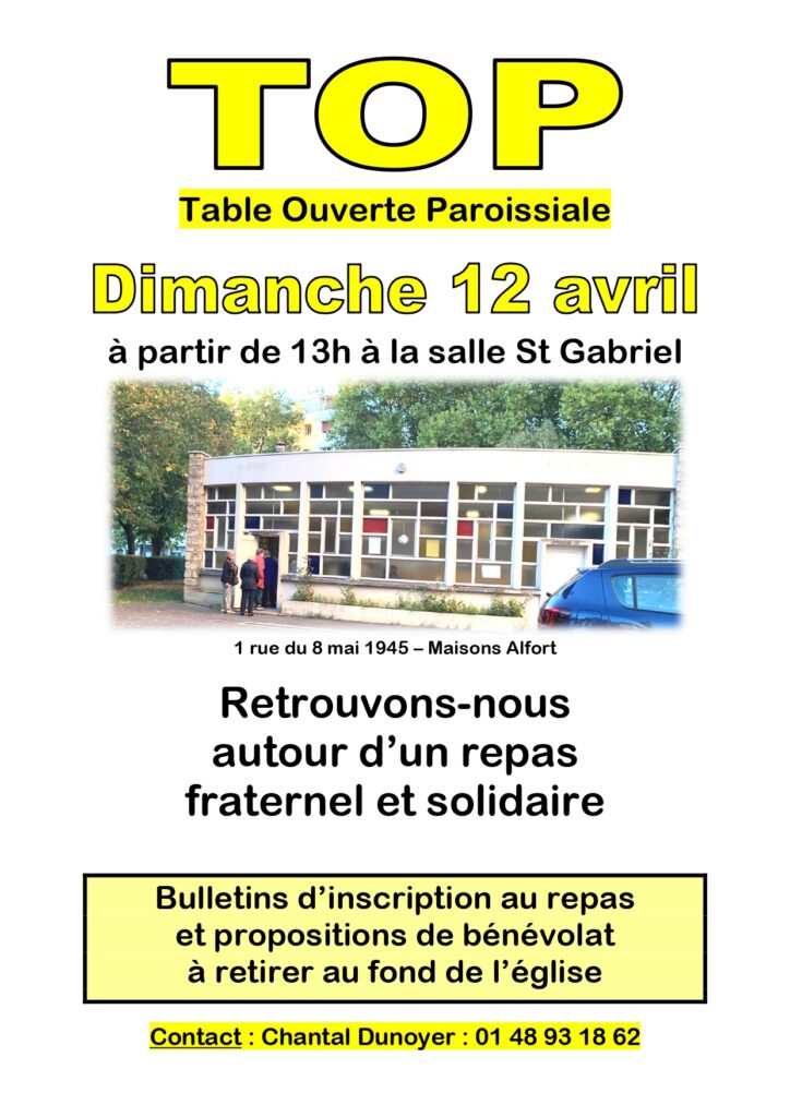 Notre paroisse organise, le 12 avril 2026, la 8ᵉ Table Ouverte Paroissiale (La TOP), dans un esprit de joie et de partage, à la salle Saint-Gabriel, 1 rue du 8 mai 1945 à Maisons-Alfort.